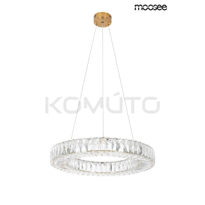 Lampa wisząca ALLISIA 80 marki MOOSEE to luksusowy żyrandol, który łączy klasyczną elegancję z nowoczesnym stylem. Jego konstrukcja opiera się na złotej obręczy, ozdobionej kryształowym szkłem, które w efektowny sposób rozprasza i odbija światło. Subtelne złote refleksy delikatnie przebijające się przez kryształy nadają wnętrzu wyjątkowego blasku i prestiżu.