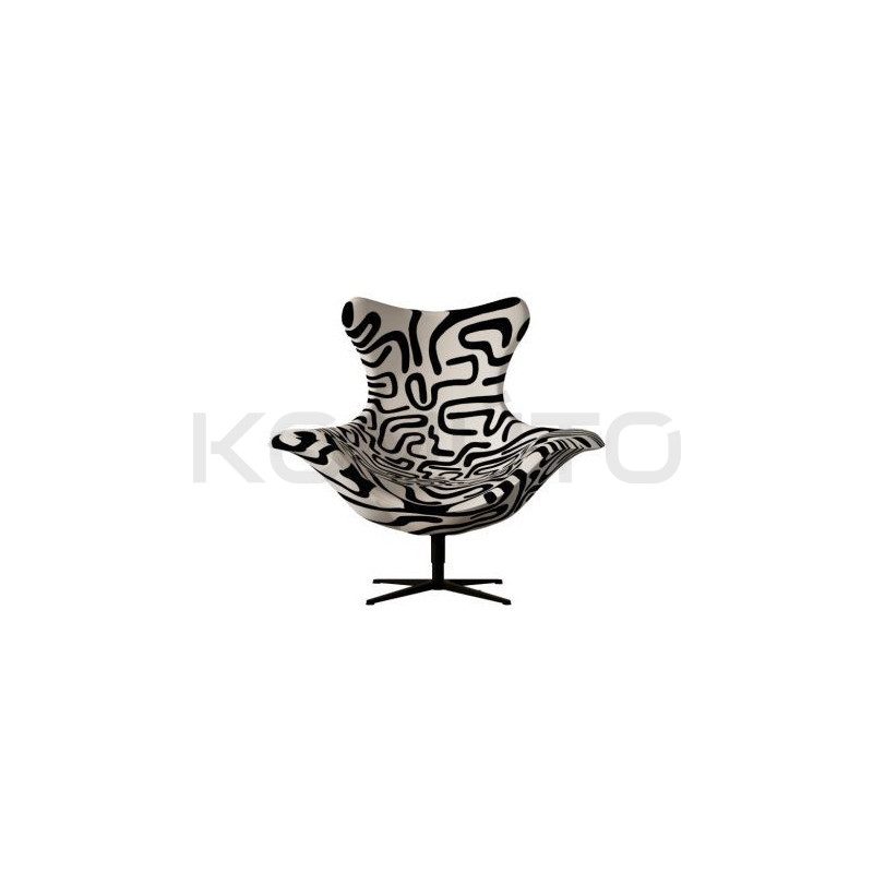 Fotel Black Line to połączenie funkcjonalności z artystycznym wyrazem. Ręcznie zaprojektowana przez Katarzynę Jasyk tkanina z wijącymi się czarnymi liniami na białym tle przywodzi na myśl awangardowe kompozycje wizualne, wprowadzając do wnętrza kreatywność i indywidualny styl. Każdy egzemplarz jest interpretacją nowoczesnego designu, tworząc unikatowy akcent w minimalistycznych, loftowych czy pop-artowych przestrzeniach.