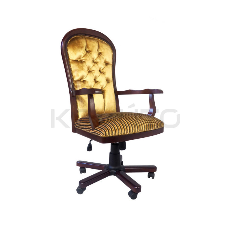 Fotel został stworzony na indywidualne zamówienie, a dzięki różnorodności tkanin możesz dopasować go do dowolnego wnętrza – od reprezentacyjnego gabinetu po domowe biuro. Solidny drewniany stelaż i praktyczna pięcioramienna podstawa na kółkach zapewniają wygodę i ergonomię pracy.