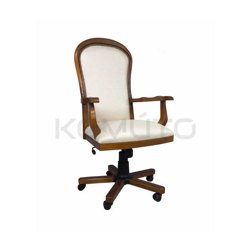Wyprofilowane drewniane podłokietniki oraz solidny drewniany stelaż gwarantują wygodę i trwałość, a pięcioramienna podstawa na kółkach pozwala na swobodne przemieszczanie się w obrębie biura. Ten fotel to nie tylko mebel – to artystyczny element gabinetu, który łączy styl, elegancję i funkcjonalność.